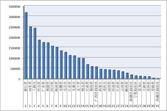 2016年1-9月各?。▍^(qū)、市)拍賣成交情況 1-9月,我國31個?。▍^(qū)、市)拍賣成交額超過200億的有3個?。▍^(qū)、市),分別是浙江省、山東省、上海市(見圖3)。3個?。▍^(qū)、市)共計成交809.83億元,占上半年全行業(yè)拍賣成交額的28.37%。 拍賣成交額在100-200億區(qū)間的有9個?。▍^(qū)、市),分別有河北省、廣東省、福建省、四川市、海南省、安徽省、北京市、江蘇省和天津市,3個?。▍^(qū)、市)共計成交1323.96億元,占上半年全行業(yè)拍賣成交額的46.38%。 拍賣成交額在20-100億區(qū)間的有12個省(區(qū)、市),分別是遼寧省、湖北省、甘肅省、湖南省、廣西區(qū)自治區(qū)、內(nèi)蒙古、重慶市、山西省、河南省、江西省、云南省和陜西省,12個?。▍^(qū)、市)共計成交651.93億元,占上半年全行業(yè)拍賣成交額的22.84%。 拍賣成交額在1-20億元的有7個?。▍^(qū)、市),分別是寧夏自治區(qū)、新疆自治區(qū)、貴州省、黑龍江省、吉林省、青海省和西藏自治區(qū)。 ![]() 圖3 2016年1-9月各省(區(qū)、市)拍賣成交情況 |